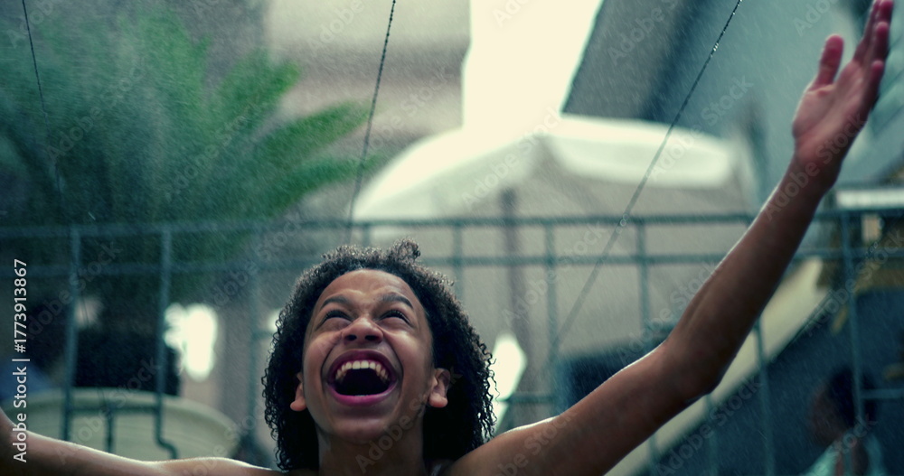 Photos Smiling child of African descent under water spray, face lifted in pure joy, arm