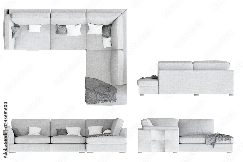 Photos Sofa 3D Rendering Stock Illustration on transparent background, top view, side view and front view