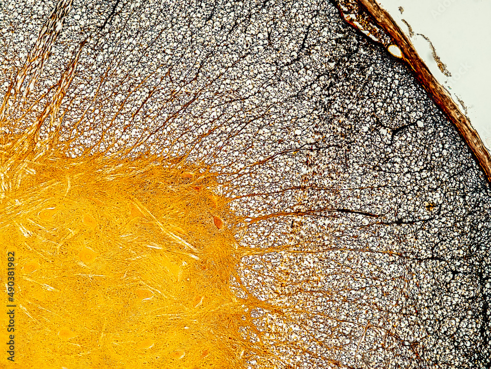 Photos Spinal cord cross section under the microscope showing neurones and glial cells