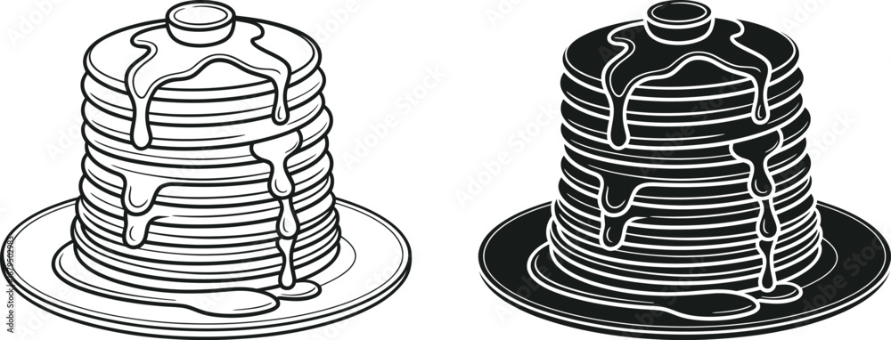 Tableau sur toile Stack of delicious pancakes with syrup in black and white line art