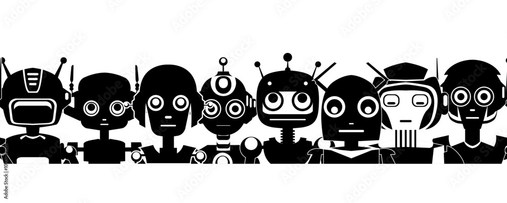 Tableau sur toile Child cheerful horizontal banner with black silhouette of cartoon robots isolated from background