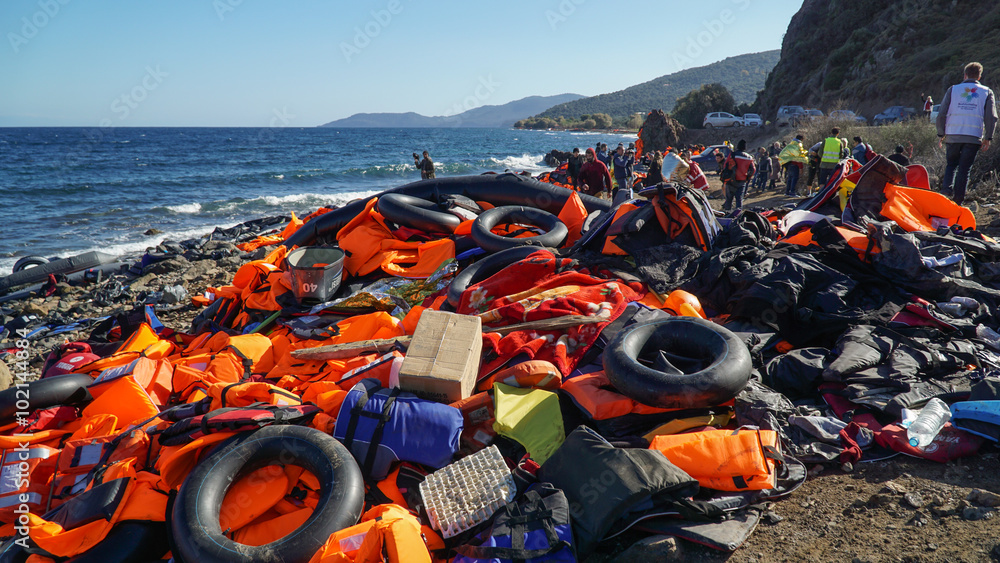Tableau sur toile Abandoned belongings and life jackets on the Lesvos shore