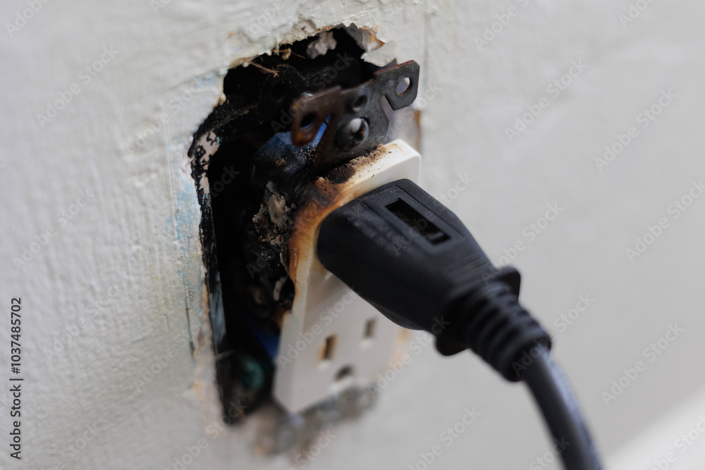 Tableau sur toile A close-up of a burnt electrical outlet with a plug still inserted, showing signs of damage from an electrical fire caused by faulty wiring