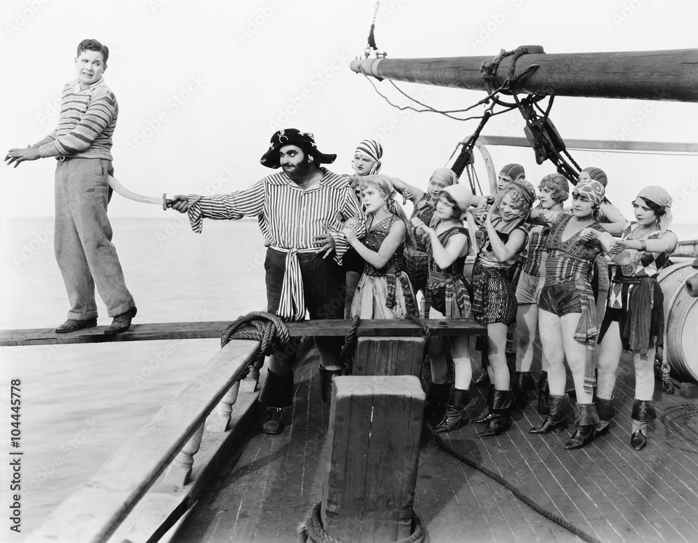Tableau sur toile Group of pirates trying to push a young man over a plank