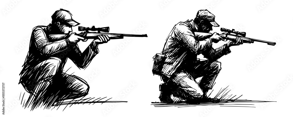 Tableau sur toile detailed black vector of a hunter with a scoped rifle in kneeling position, prep