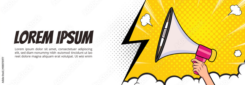 Tableau sur toile Hand holds megaphone bullhorn in retro pop art comic style Advertising banner with megaphone