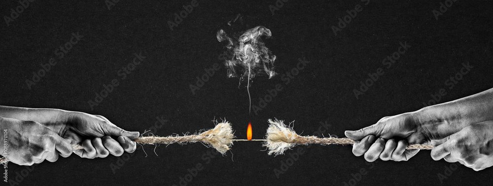 Tableau sur toile Hands in Black and White Pulling Burning Frayed Rope to Opposite Sides at Breaki