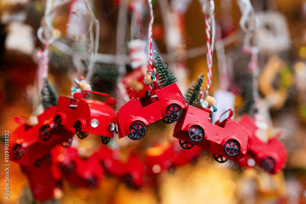 Tableau sur toile Red metal toy cars adorned with small green Christmas trees are hanging as festive ornaments