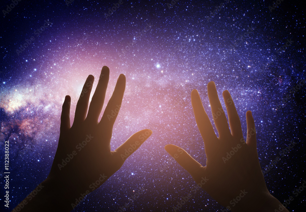 Tableau sur toile Hand reaching for the sky with dark stormy clouds