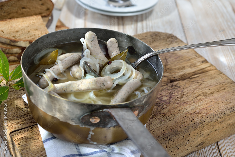 Tableau sur toile Saure Zipfel, eine fränkische Spezialität: im Zwiebel-Essigsud zubereitete Nürnb