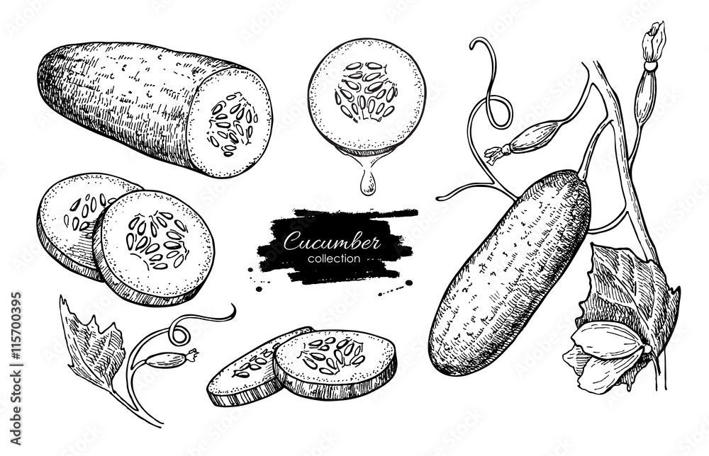 Tableau sur toile Cucumber hand drawn vector set. Isolated cucumber, sliced pieces