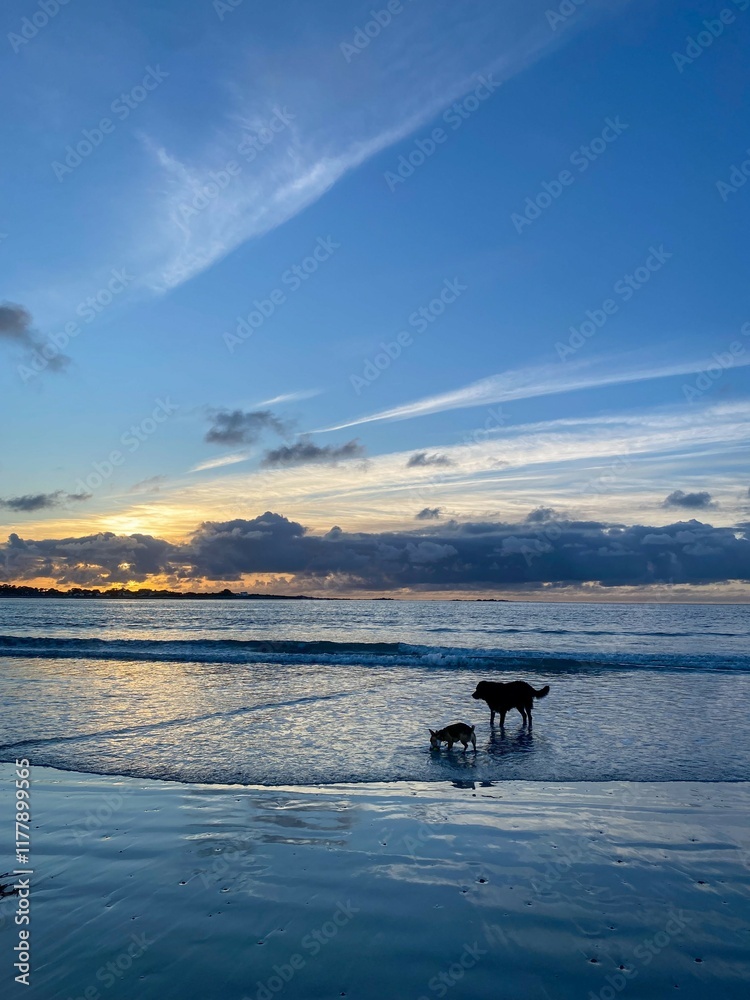 Tableau sur toile sunset over the lake with dogs