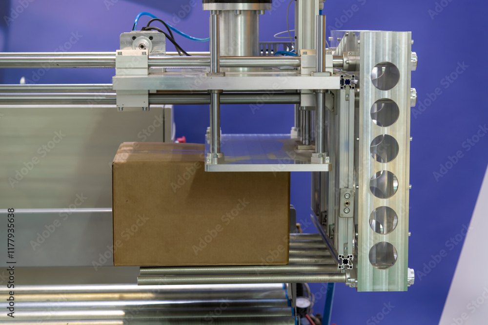 Tableau sur toile Close-up view of modern heavy robotic arm manipulator moving large blank cardboard box on conveyer belt in industrial building