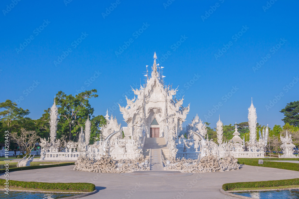 Tableau sur toile Wat Rong Khun, Chiang Rai province, northern Thailand Magnificently grand white church and reflection in the water