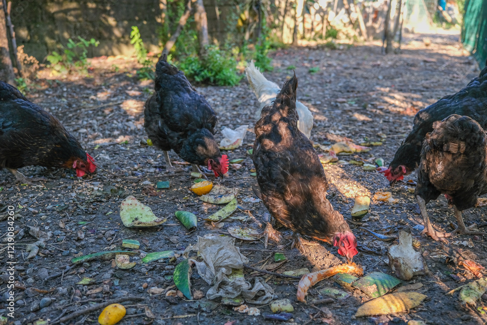 Tableau sur toile Brown chickens foraging for food on a dirt ground
