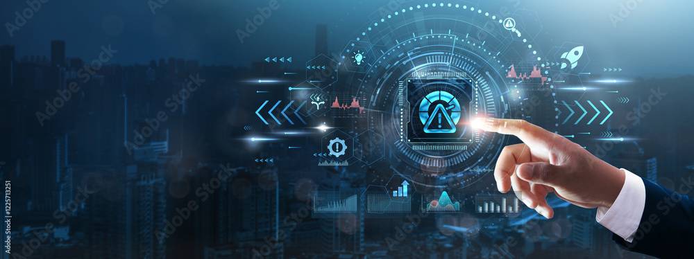 Tableau sur toile Risk Management: Businessman's hand touching futuristic technological interface, threat analysis, mitigation strategies, compliance monitoring, business continuity, and technology concept