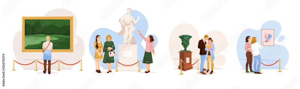 Tableau sur toile People admiring paintings, sculptures, and exhibits in a museum, minimalistic style, white background