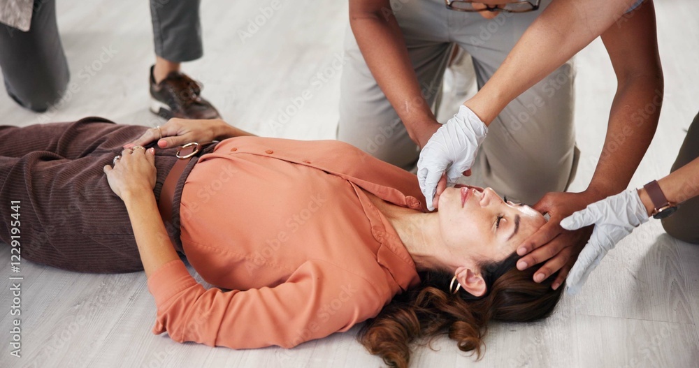 Tableau sur toile People, demonstration and class for first aid, learning or titling for prevention of choking or breathing