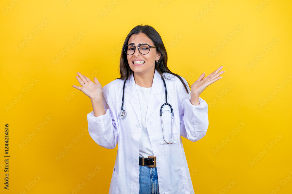 Tableau sur toile Young brunette doctor woman wearing stethoscope standing over isolated yellow ba