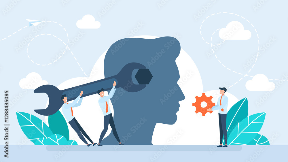 Tableau sur toile Silhouette of a human head with a wrench tool and nut