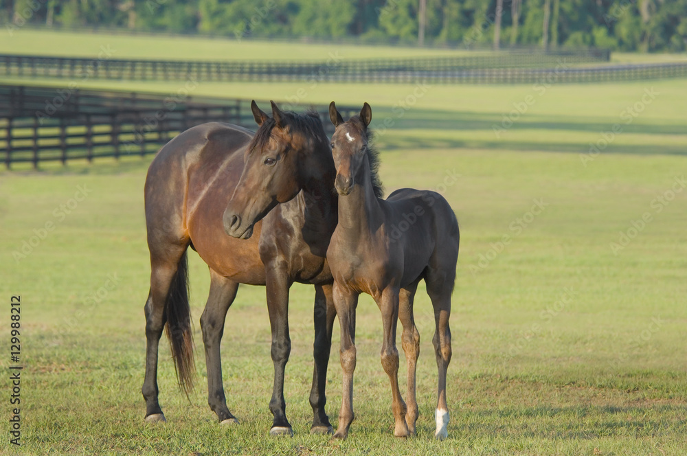 Tableau sur toile thoroughbred horse mare with foal in large pasture