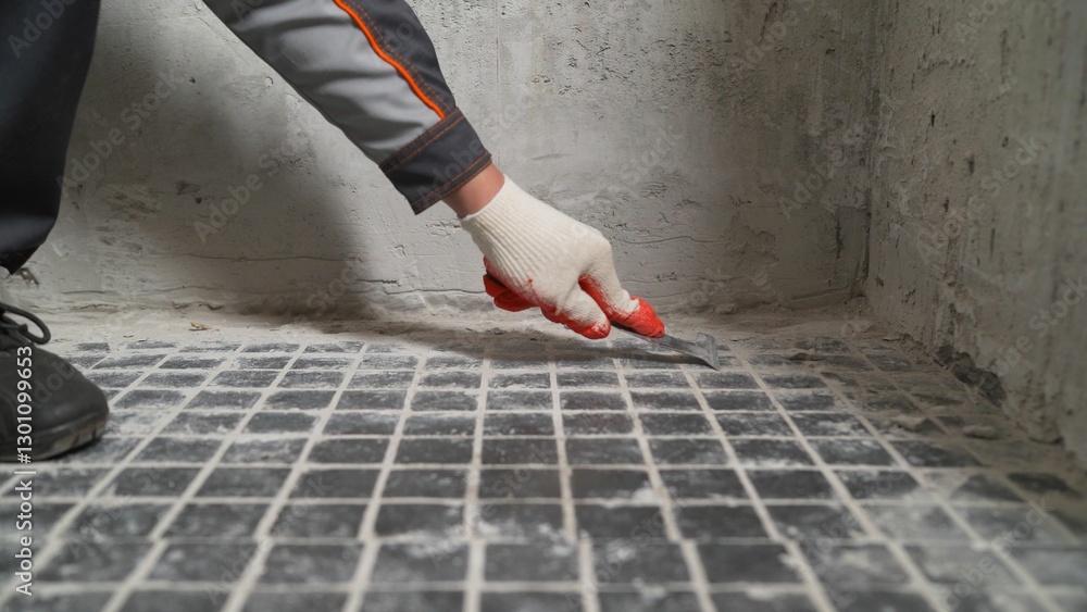 Tableau sur toile Construction worker removing grout between tiles using a scraper, preparing the