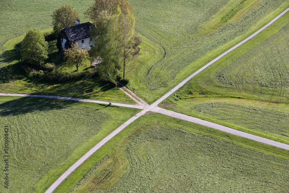 Tableau sur toile Aerial panoramic view from the top of Hohensalzburg fortress (Castle) on cultivated land divided by the crossing ways (roads)