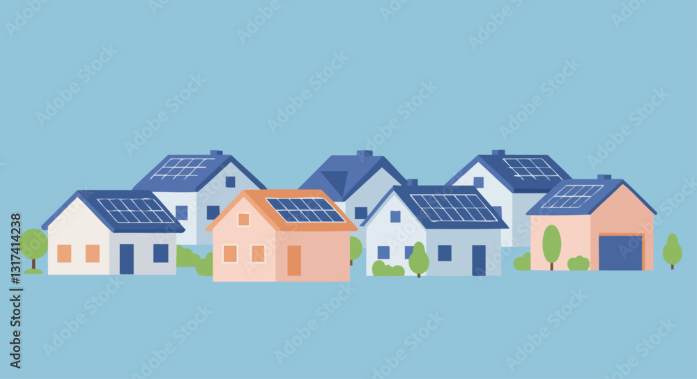 Tableau sur toile Illustrated homes with solar panels on rooftops in a suburban neighborhood, highlighting clean and renewable energy solutions