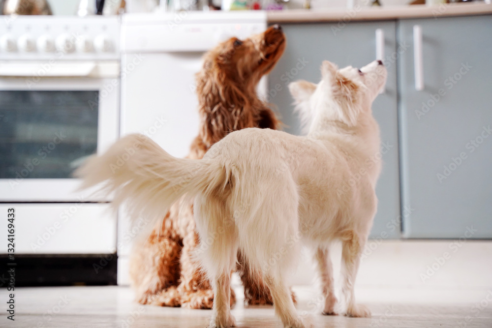 Tableau sur toile Two dogs at home waiting for food for breakfast