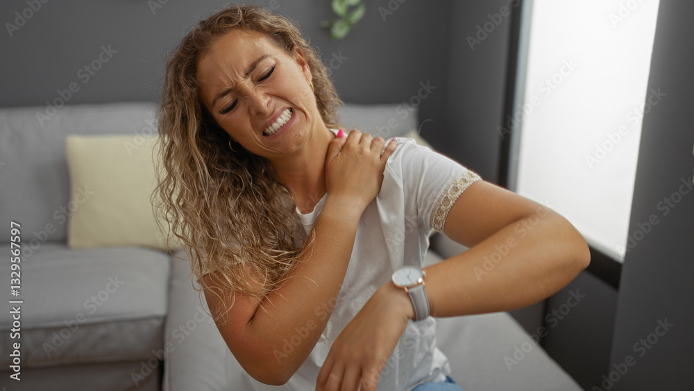 Tableau sur toile Woman experiencing shoulder pain sitting in a living room, expressing discomfort in a home interior setting with a grey couch in the background