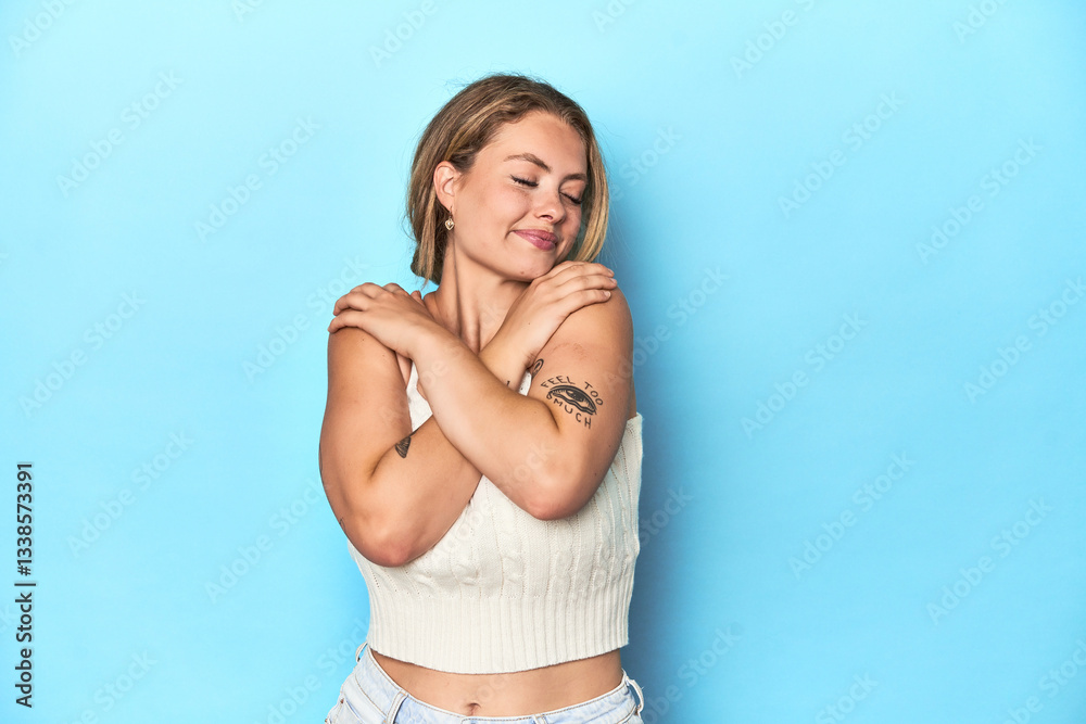 Tableau sur toile Blonde young woman in white top on blue background hugs, smiling carefree and happy