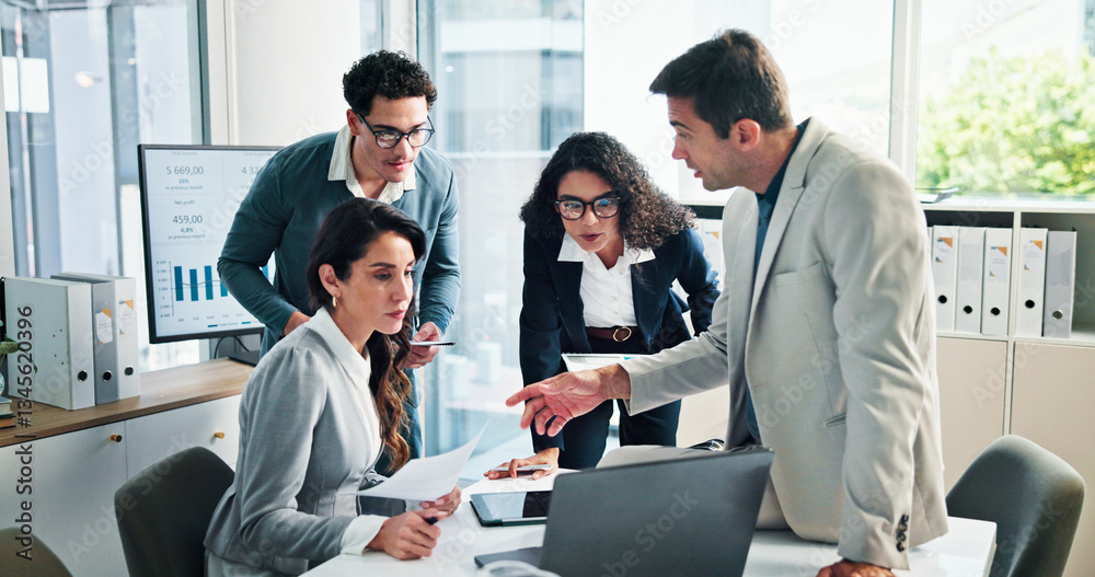 Tableau sur toile Paperwork, laptop or business people with shareholders in discussion for planning and capital growth