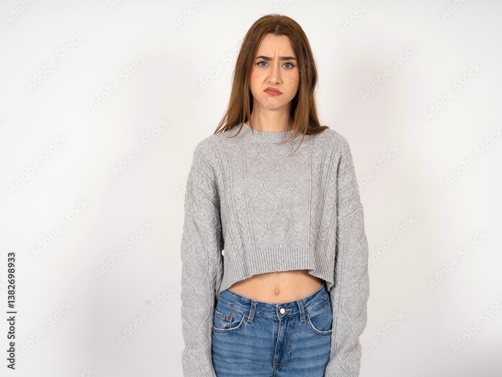 Tableau sur toile Offended dissatisfied Caucasian young girl wearing grey sweater with moody displ
