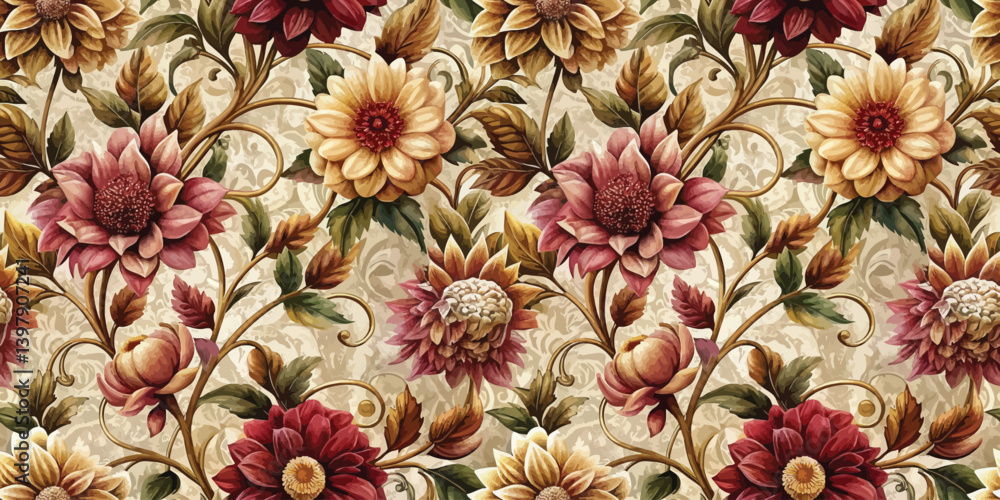Tableau sur toile Vibrant floral pattern with elegant sunflowers and intricate leaves