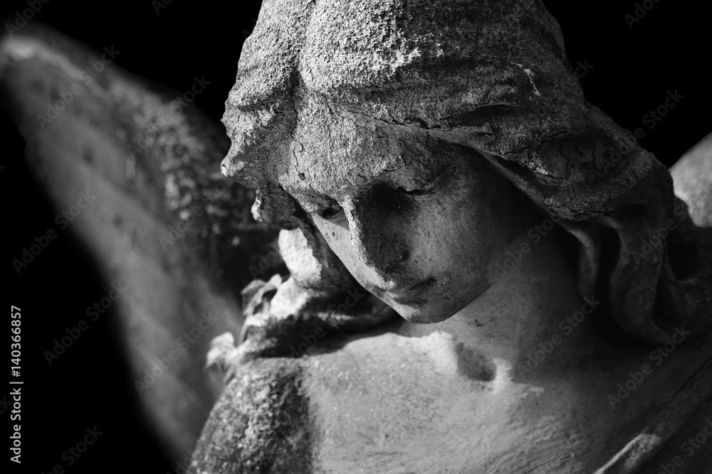 Beautiful close up af a face angel marble sculpture with a sweet expression that looks down