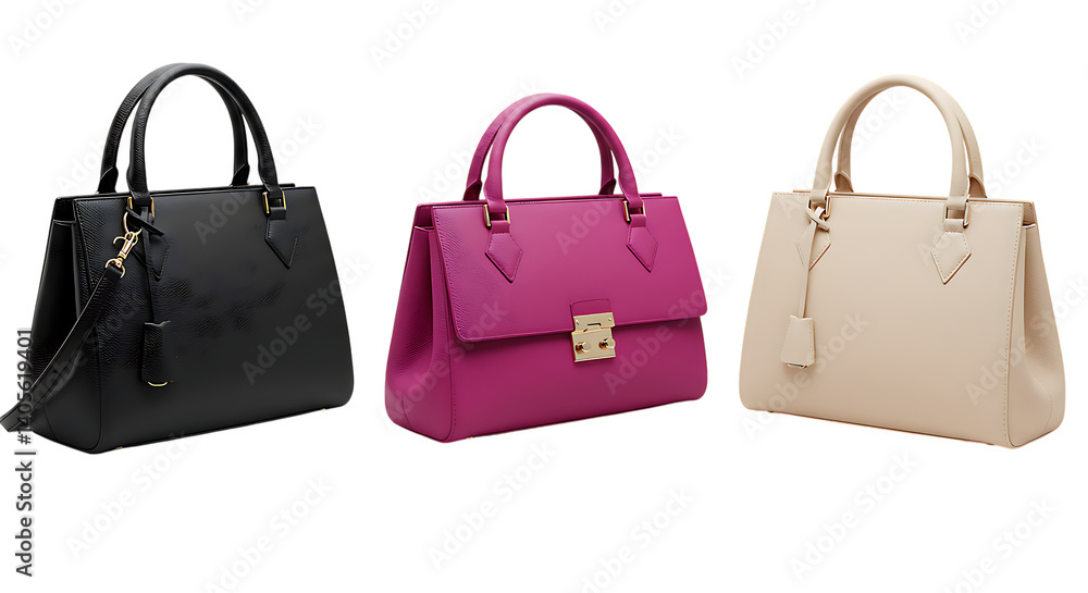 Tableau sur toile Three fashionable handbags in black, pink, and beige colors placed on a clean white background looking stylish, elegant, and perfect for everyday use or special events
