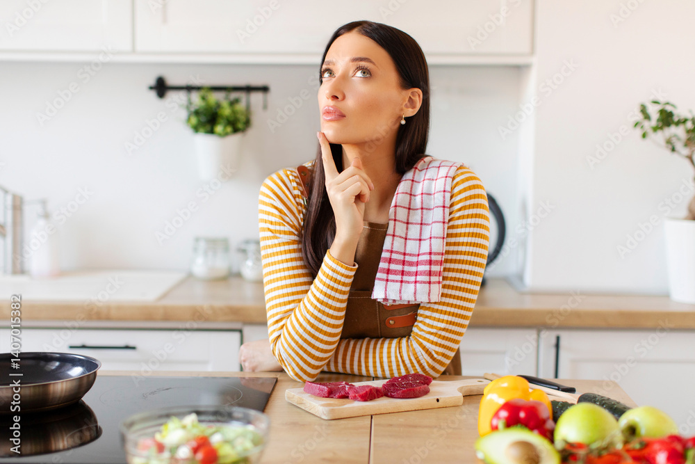 Tableau sur toile Pensive woman touching chin, reminding recipe while cooking tasty dinner at home