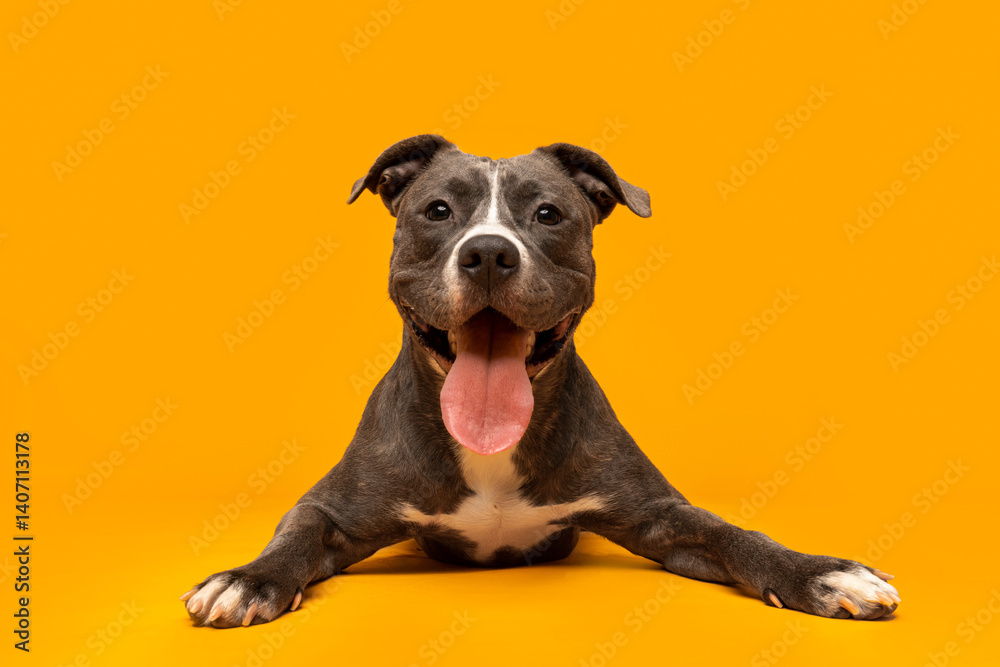Tableau sur toile Playful Gray and White Dog Smiling on Bright Yellow Backdrop