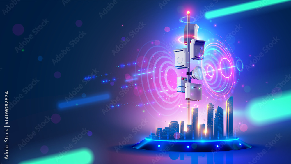 Tableau sur toile 5g cell network communication tower or antenna transmits wireless signal on smart city