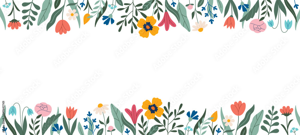 Tableau sur toile Decorative frame, border, frieze with flowers - poppies, tulips, leaves, lilies, daffodils