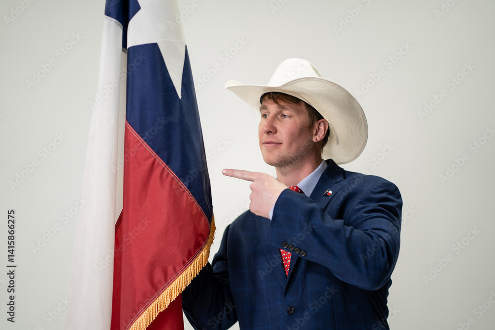 Tableau sur toile Smiling Texas Businessman Politician Wearing Cowboy Hat and Suit Looking and Poi