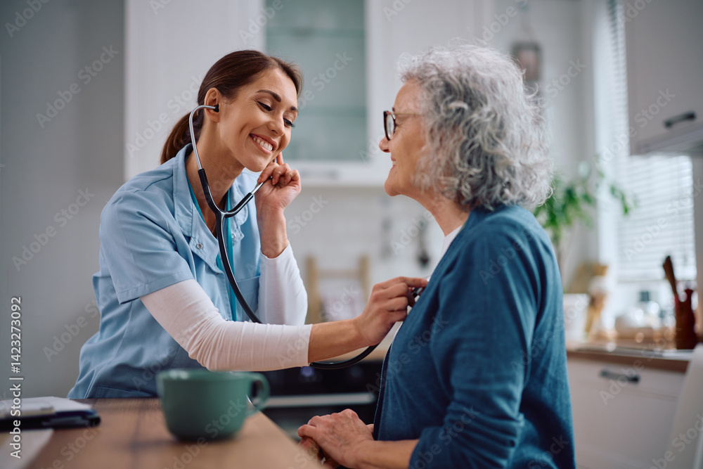 Tableau sur toile Happy nurse checking heartbeat of senior patient with stethoscope during home visit