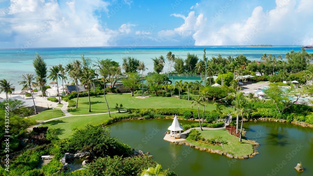 Tableau sur toile Landscaped gardens Pristine blue waters of the Micro Beach and the far-off Managaha Island backdrops a perfectly manicured garden with pond in Saipan, Northern Mariana Islands