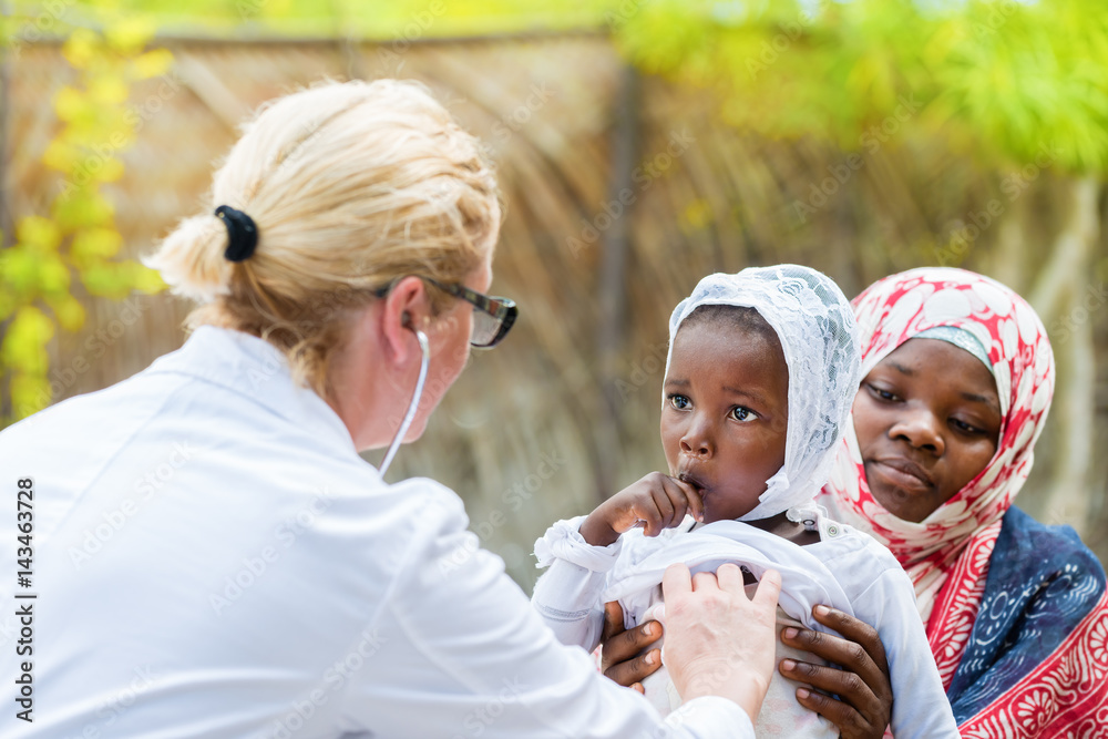 Tableau sur toile Female Caucasian doctor listening heart beat and breathing of little African girl with stethoscope