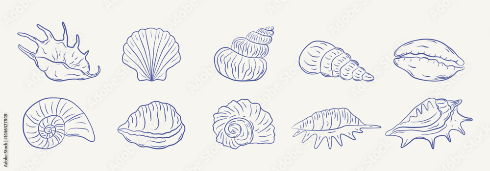 Tableau sur toile Set of hand-drawn seashells in monochrome blue ink