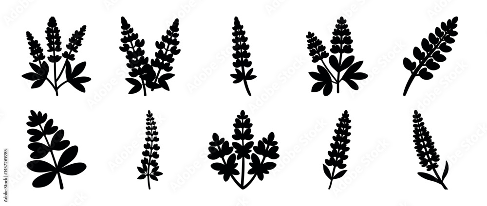 Tableau sur toile Collection of graphic black lupine flowers and foliage on a white backdrop