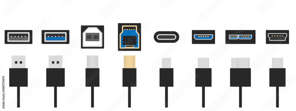 Tableau sur toile Variety of USB Connector Types Illustration – Type A, B, C, Mini, Micro, and USB 3
