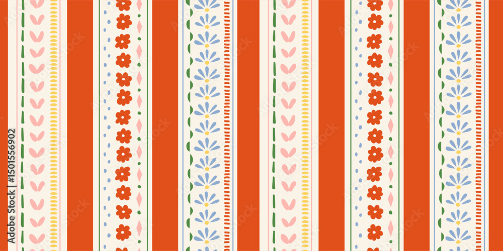 Tableau sur toile Seamless pattern with ink doodle abstract flowers and strokes in vertical stripes
