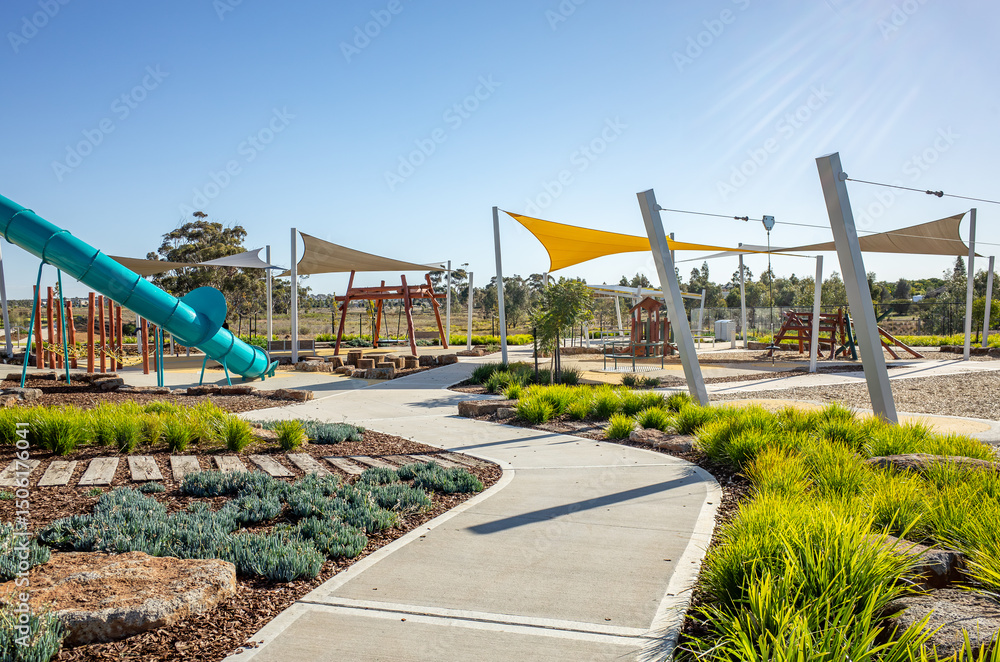 Tableau sur toile A well-designed public playground in suburban Australia, featuring large shade sails, and landscaped garden beds