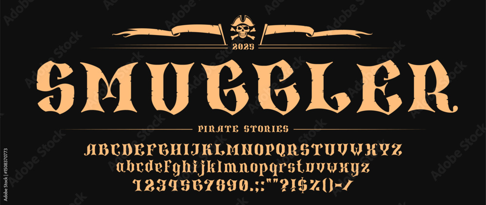 Tableau sur toile Medieval pirate font or corsair typeface and Western type, vector nautical English alphabet